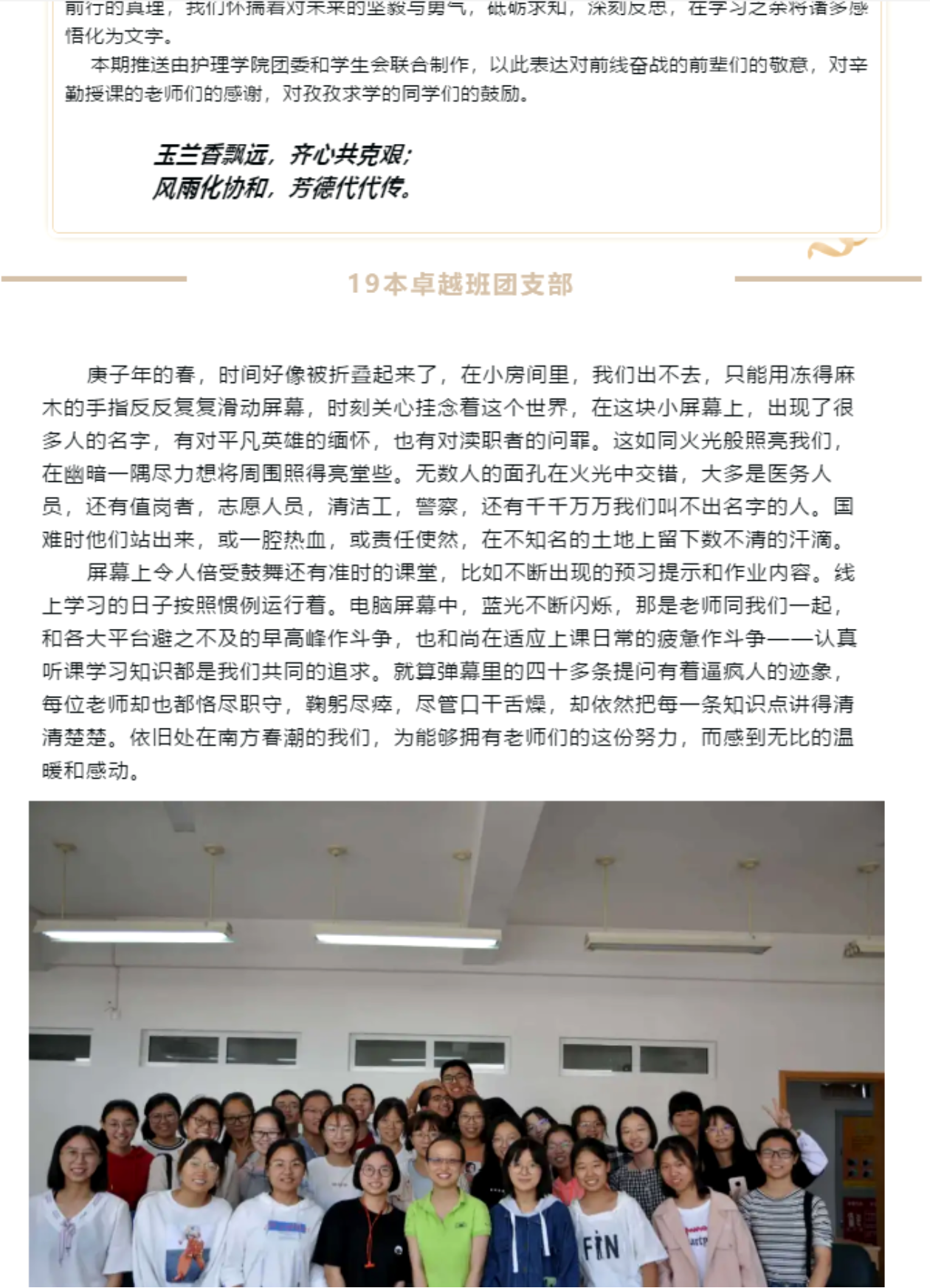 本次活动自2020年2月18日起由学习部成员开始向各班团委进行稿件收集,进行审核修改后,于2月26日在白衣巷公众号发布。通过平台呈现出的文章,有的体现了作为一名护理专业的学生,对本次新型冠状病毒疫情的思考和对自身使命与责任的探求;有的表达了面对新的教学模式,同学们对网上教学的感触以及对新学期的期许;还有部分文章诉说了对无法如期相见的同学们、老师们的思念以及表达了对奋战在疫情前线医护人员的祝福。