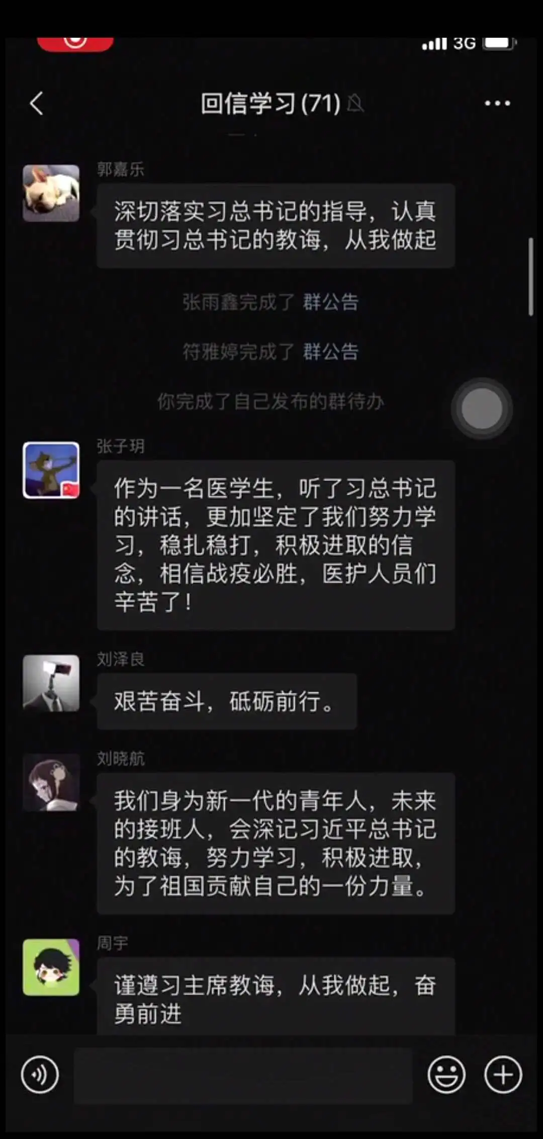 此次团支部活动不仅是团干部在特殊时期发挥职责作用的展现与落实,更是及时为团支部思想与行动的继续砥砺前行提供了动力,同时也使我们重新认识与思考以天下为己任的医学生素养情怀,以及警诫提醒我们特殊时期不要因为突发情况阻碍了专业学习的步伐与进程。